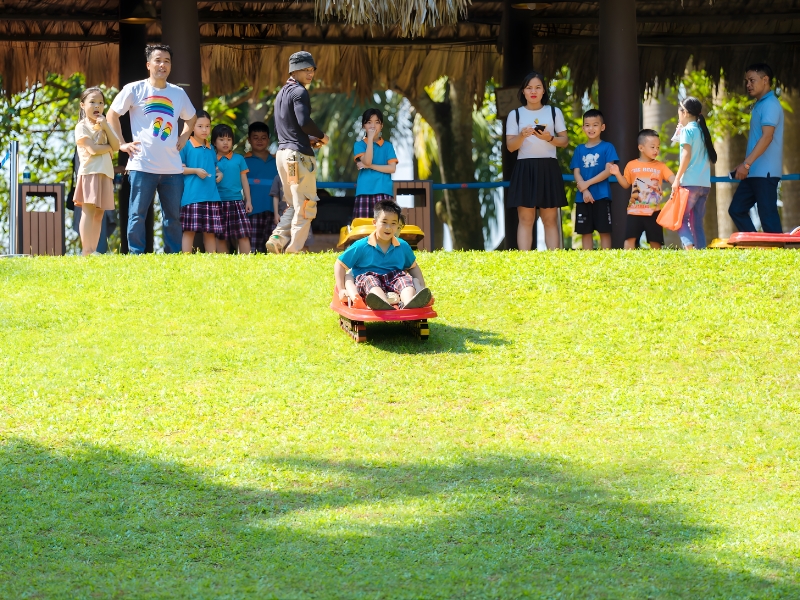 Bãi cỏ rộng tổ chức team building: Không gian sân cỏ rộng và bằng phẳng giúp dễ dàng triển khai các trò chơi vận động, thử thách đồng đội và hoạt động gắn kết tập thể.